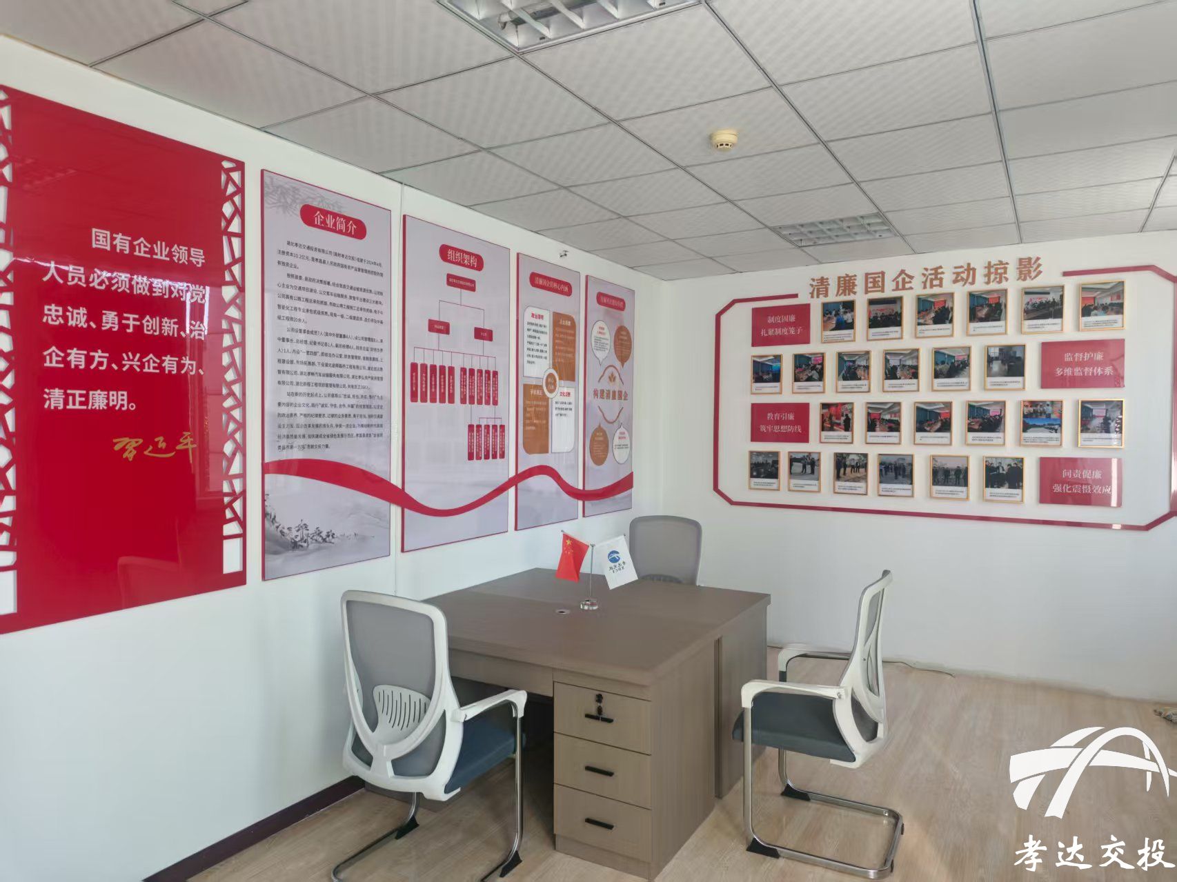近日,孝达交投充分利用公司走廊和办公室墙体空间,精心打造了集观赏性、艺术性和教育性于一体的“清廉文化示范区”,在各办公室还悬挂廉洁文化书法作品,抬头可见“廉”景、行走可沐“廉”风。顺着“清廉文化教育走廊”的指示标语到“廉洁教育”活动室,活动室文化墙充分融入国企政治建设、制度建设、人才建设、文化建设的“廉”元素,并以图文展板相结合的方式,营造了崇廉尚洁的浓厚氛围。公司还设置特色廉政文化橱窗,向群众宣传“廉”故事,这些只是孝达交投积极开展“清廉国企”建设的一个缩影,将廉洁文化以“润物细无声”的方式渗透到每一名干部职工心中,让全体员工在工作中接受“潜移默化”的廉洁文化教育。